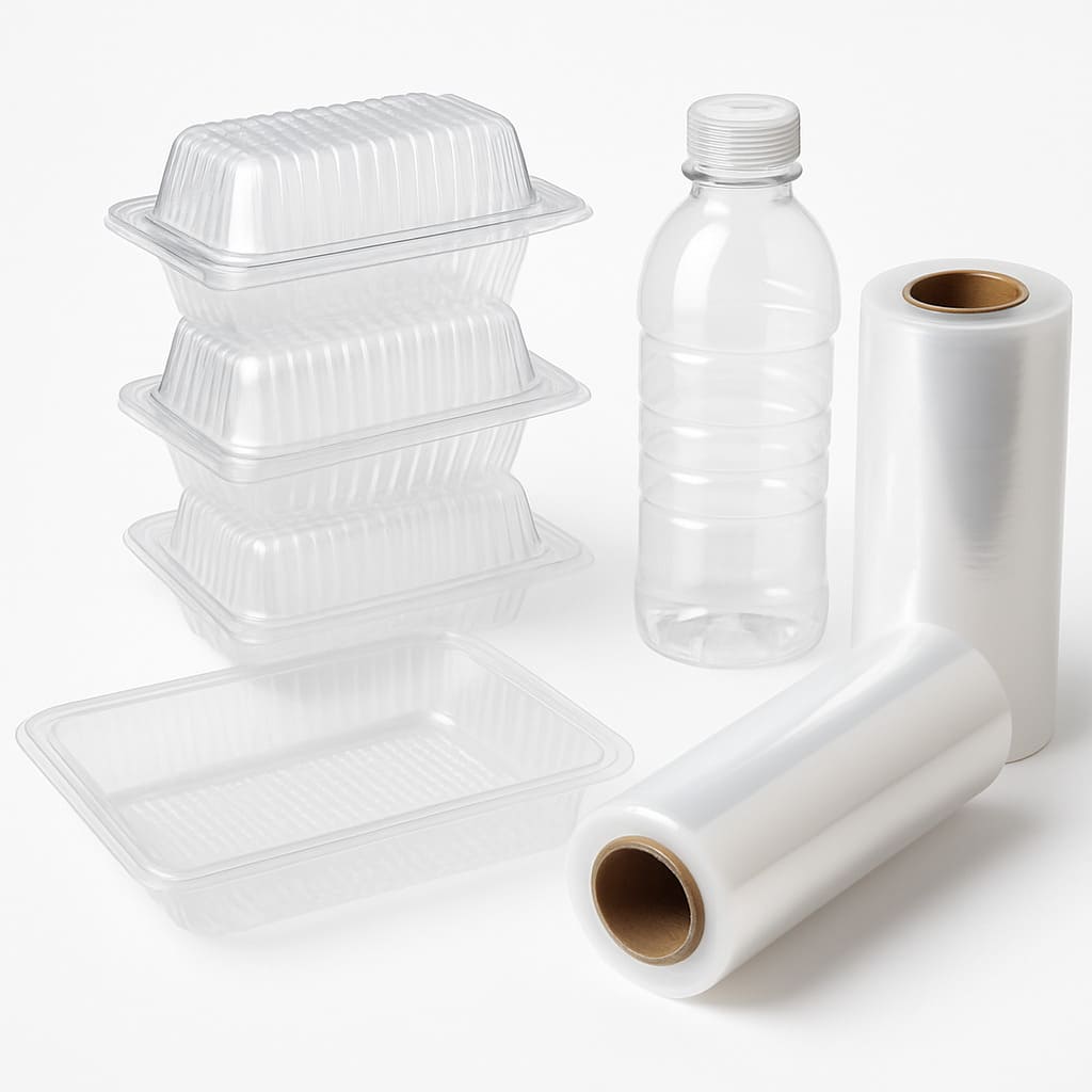 1. Определяем тип упаковки. Плёнка, лотки, стаканы, контейнеры, крышки — всё, что может контактировать с пищевыми продуктами. Здесь же уточняем материал: ПЭТ, ПП, ПВД, многослойные структуры.
